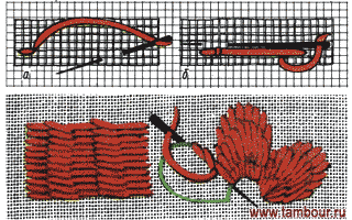 Стежки полтавской глади вышивают слева направо и так плотно, чтобы не проглядывал фон ткани. Удобна гладь тем, что можно делать стежок от 1 до 3 см, заполняя большие плоскости элементов узора. Чтобы такой длинный стежок не отставал от ткани, его прикрепляют сверху вспомогательным диагональным стежком. Выполняют это так. Закрепив нитку петлей или стежками, делают длинный стежок. Иглу вкалывают справа через 1,5 см и выводят налево через 3—4 мм снизу под стежком (рис. а). Протягивают рабочую нить. Затем иглу вкалывают по диагонали через 5 или 6 мм над стежком (рис. б) и выводят рядом с началом первого стежка. Все последующие стежки делают так же параллельно друг другу. При длине стежка от 2 до 3 см сверху делают 2 или 3 вспомогательных диагональных стежка. Гладь будет красивой, если во всех стежках вспомогательные стежки делают на одном уровне.